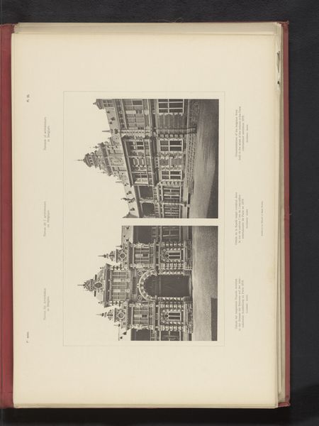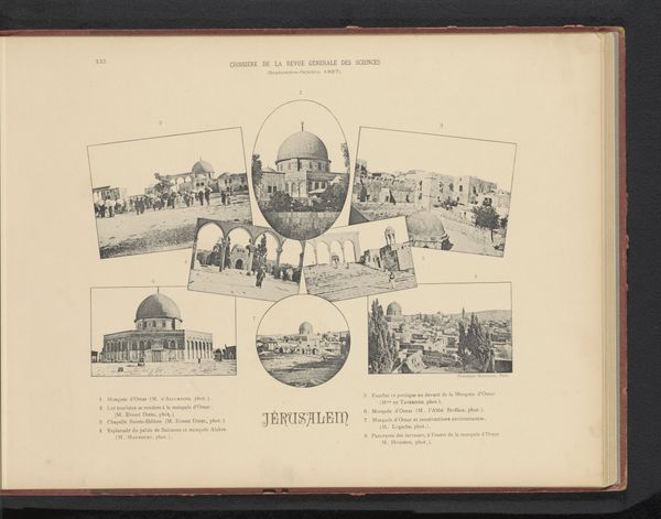This is a photographic print of Messina in Italy, made by Jules Calas. It's a collaged page of black and white photographs, likely printed using photogravure. The images are neatly arranged, each offering a different view of the city. We see the cathedral, the harbor, and even the railway. The heart-shaped photo is an interesting sentimental touch that frames Messina as an idyllic location. The way that Calas has assembled these images speaks to the rise of mass media and printed ephemera, and hints at changing modes of cultural production. The choice of black and white photography adds a certain formality, typical of the time. This contrasts with the collage, an inherently modern form of art-making. The printmaking process itself involved skilled labor and industrial techniques, demonstrating the intertwining of art, technology, and the world of work. Calas captured Messina at a pivotal moment, where traditional artistry met new modes of production.