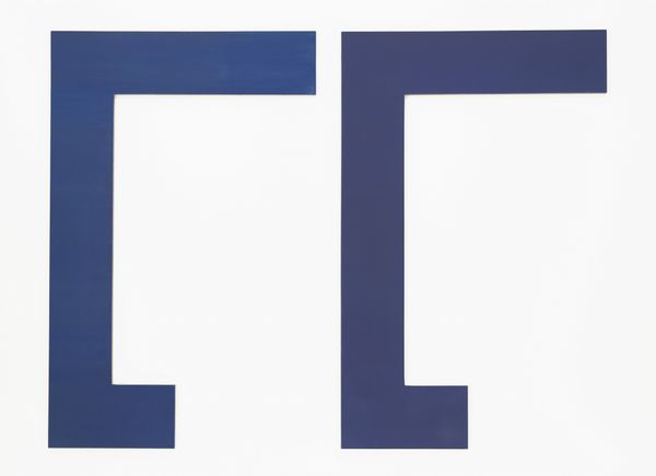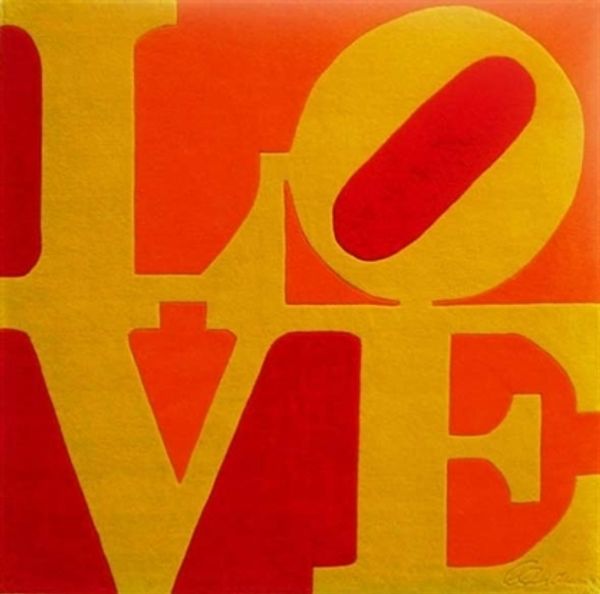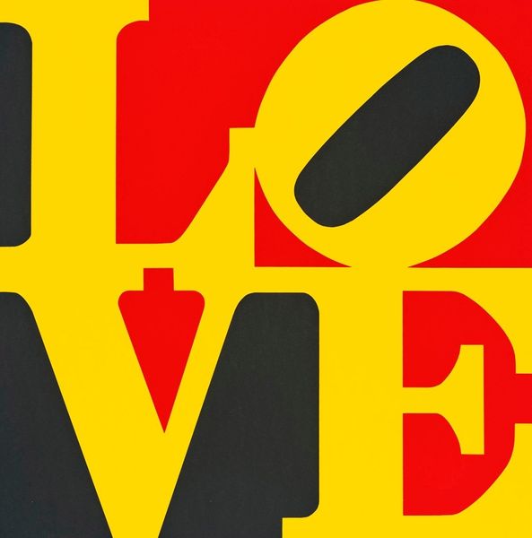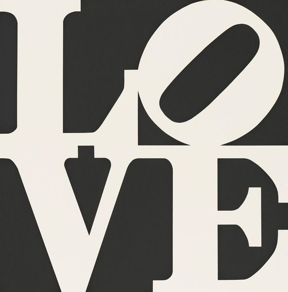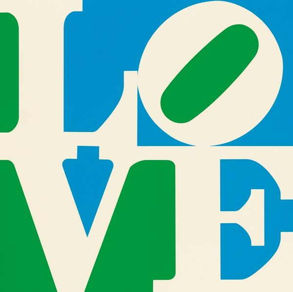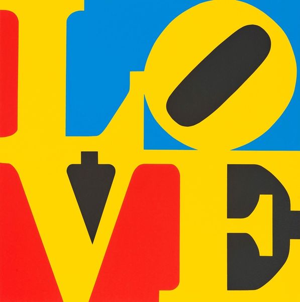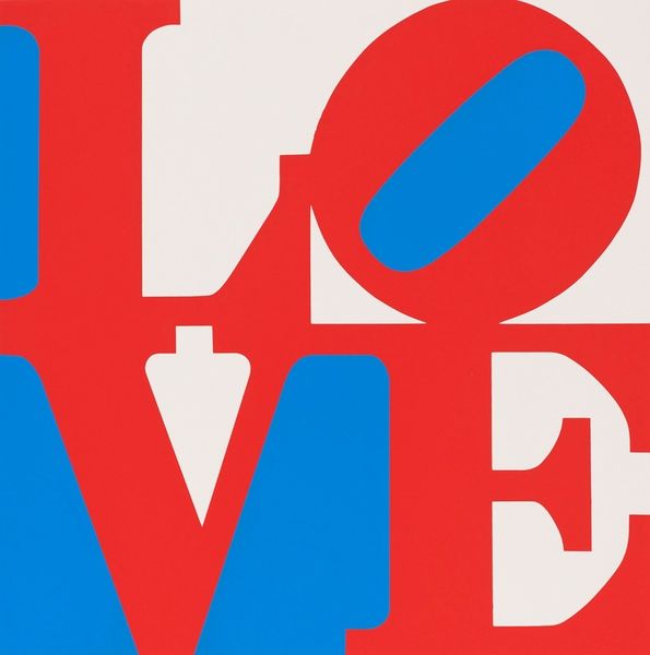 Editor: This is Robert Indiana's *Book of Love #11* from 1996, made using acrylic paint. It's strikingly simple: block letters against a vibrant background. I'm curious, beyond the obvious message, what else do you see in this piece? Curator: Well, the image screams ‘love,’ but it’s a very specific type of ‘love’ that Indiana presents. Note how the 'O' tilts, disrupting the conventional, balanced form we expect. It's Pop Art, certainly, a flattened symbol, but what feelings does the tilted "O" evoke for you? Editor: It makes me feel a bit uneasy actually. Like something is off-balance. Curator: Precisely. The tilted "O" undermines any simple reading, it is not just a celebration, but a probing exploration of emotional complexity. Is this image really a clear reflection of ‘love’ as straightforward as one might initially think? Or could the use of intense colour serve to highlight an ambiguity within? Editor: So the image is questioning the very idea it seems to be promoting? It makes me think of the different ways love is depicted or represented. It's iconic, but also quite loaded, right? Curator: Indeed. How potent an icon it has become speaks to something deep in our collective cultural consciousness. Perhaps it is a mirror, reflecting our shifting understandings of love across time. Its success demonstrates love is always negotiated within a symbolic field. Editor: This has shifted how I perceive seemingly direct imagery! Thanks for sharing this intriguing perspective. Curator: My pleasure. I've learned something, too: that iconic images can still surprise us with fresh meanings.