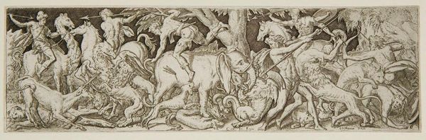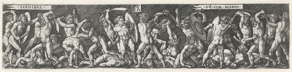 Editor: Here we have "Combat of Eleven Nude Men on Foot," a fascinating, undated engraving by an anonymous artist, currently residing at the Harvard Art Museums. It feels incredibly dynamic and violent. What's your interpretation of this piece? Curator: It's intriguing how the artist portrays this scene of conflict, particularly given the historical context of image production and dissemination. Notice the classical allusions with the figures, contrasting with the brutal, almost chaotic, composition. How might this reflect the socio-political climate of its time? Editor: That's a great point! Maybe the chaos mirrors the political unrest. I hadn't considered that the classical style could be used to highlight the contrast with violence. Curator: Exactly! And remember, the artwork's public role is crucial. It invites us to question how such imagery shapes and reflects societal values, especially concerning conflict and masculinity. Considering this, does the artwork's meaning shift for you? Editor: Absolutely. Seeing it as a reflection of society rather than just a depiction of a fight makes it far more complex and relevant. Thank you. Curator: My pleasure. It is always fascinating to think about how art actively engages with society.
