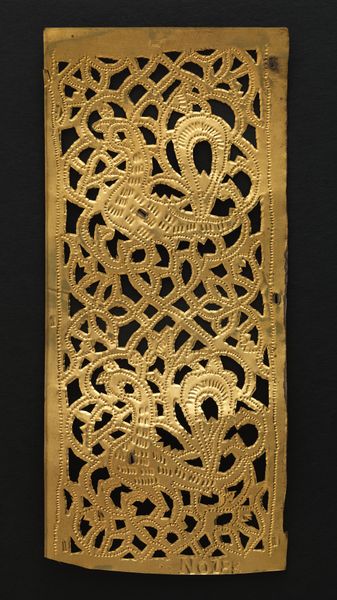 Editor: This is "Cutout" by Lockwood de Forest, made sometime between 1867 and 1917. It's a gold-colored metal relief, and the design is really intricate. It has this dazzling quality, a bit like something you'd see in a dream. What do you see in this piece? Curator: Immediately, I am drawn to the symbolic language at play. Notice the careful repetition of geometric forms and floral motifs. Do you recognize a cultural tradition being evoked? Editor: Islamic art? It's one of the tags… but how does the symbolism work here? Curator: Indeed. Islamic art often employs geometric patterns to represent the underlying order of the universe and the unity of God. Floral motifs evoke paradise, a concept rich in symbolic meaning across cultures. It speaks of renewal, beauty, and the divine presence in nature. Editor: So the artist isn't just decorating, they are communicating beliefs? Curator: Precisely. The cutout form itself, think of filigree and screens, performs a sacred function to create division or privacy. Notice the two mirrored peacocks at the center; does that bring any association? Editor: Oh wow! They look like mirror images. Is that kind of mirroring a typical decorative technique in Islamic art, or does it point to something deeper? Curator: It’s not necessarily "typical," but symmetry is a key organizing principle which could denote balance and harmony. These peacocks become metaphors for duality and reflection, echoing our own capacity for self-awareness and spiritual insight. But why these birds instead of something else? Editor: Interesting! It definitely makes me think differently about decorative arts – it isn't only aesthetics, it also expresses deeper connections between culture and human experiences. Curator: Exactly! Through visual symbols, de Forest isn't just making an aesthetic statement, but also opening up cross-cultural dialogues about history, belief, and the power of shared human experience.