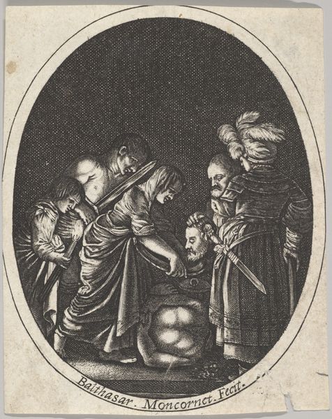 Hendrick Goudt's engraving depicts Salome receiving the head of John the Baptist, captured within a tight oval composition. The stark contrast between light and shadow, achieved through dense cross-hatching, amplifies the drama of the scene. The figures are arranged in a frieze-like manner, compressed into the foreground. This intensifies the psychological tension and physicality of the event. Salome is centrally positioned, almost merging the gruesome act with a strange elegance. The oval format itself, often associated with portraiture and precious objects, paradoxically frames this brutal scene, highlighting the intersection of beauty and horror. Goudt masterfully uses the limited space to create a stage where the formal constraints amplify the narrative's intensity. The composition challenges conventional representations of biblical scenes. It destabilizes the viewer's expectations by merging aesthetic refinement with graphic violence.