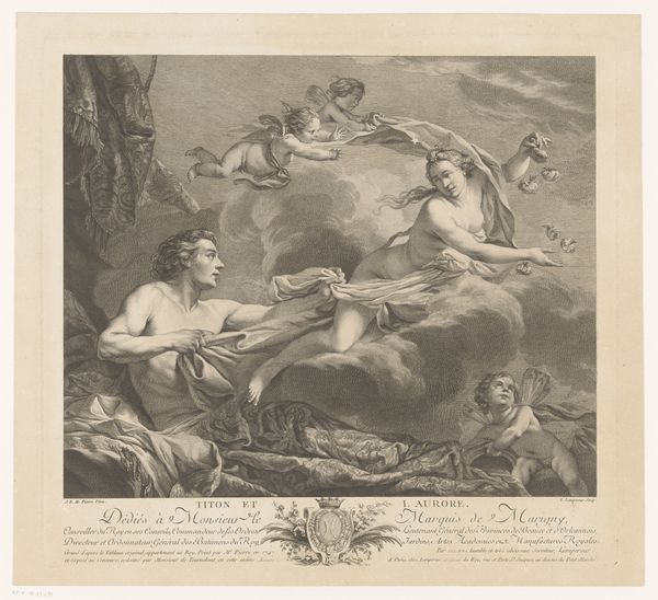 Editor: So, this is Théodore Géricault’s "Stervende man met ridders bij een boom," an engraving from 1823. It’s pretty stark – lots of grey tones, and the figures are really dramatic. What strikes you most about this piece? Curator: I think Géricault's focus here highlights a critical tension within Romanticism itself. While visually compelling, the image resonates with broader concerns about power, vulnerability, and the cost of conflict. Editor: Could you elaborate on that? Curator: Certainly. Romanticism wasn't just about pretty landscapes; it wrestled with social injustice, often expressing solidarity with the marginalized. Consider the positioning of the dying man versus the knights in armour. Who holds the power? And how does the scene convey the impact of political or social conflicts on individuals, or perhaps, broader cultural trauma? Editor: The knights *do* seem quite detached. It’s as if they are not actively participating in comforting the dying man. Curator: Precisely. And this detachment can be a commentary on class disparities and political disengagement of some social groups from the real, felt struggles of others. What elements would you identify that create a sense of tension between the observer and the observed? Editor: The stark contrast in clothing definitely does. But I'm still grappling with how it challenges the status quo beyond just showing suffering. Curator: Géricault might be critiquing the romanticization of conflict itself. By placing the grim reality of death so centrally, he compels us to confront what war truly entails, thus, decentering the heroic narrative typical of that time. Editor: That makes a lot of sense. Seeing it as a form of social critique through visual storytelling – very impactful! Curator: Yes, by connecting artistic expression with socio-political consciousness. Editor: Thanks, I learned so much more about what this artwork aimed to convey.