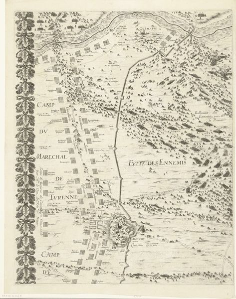 Curator: Editor: This print, "Plan van het beleg van Lille, 1708" from 1708 by an Anonymous artist, presents a baroque engraving detailing the siege of Lille. I am struck by how meticulously the siege is mapped out, almost like a carefully planned ritual. It evokes a sense of calculated power. What catches your eye when you look at this? Curator: I notice how the city is contained within this circular enclosure, this "circumvallation." The circle itself is a powerful symbol – of totality, of protection, but here, also of imprisonment. The image feels less like a celebration of victory, and more like an acknowledgment of containment, an image where one side waits for the other to exhaust. How does the artist invite us to reflect upon our place in its world? Editor: I see your point. The siege lines really emphasize that idea of containment and a forced ending, rather than victory. It is compelling how such seemingly neutral, descriptive depictions of military actions can also be imbued with profound symbols, almost allegorical in their meaning. In many ways, aren’t war maps always propaganda of some kind, to instill trust in their decisions. The print presents it more strategically and less glorifying the conflict itself. I wonder if the map invites different responses, perhaps from someone living outside, or inside the line? Curator: Exactly. Consider who this print was for, and what purpose it served. The sheer density of text below, cataloging the regiments involved, speaks to the importance of documentation, of meticulously recording history, but with whose pen, of course? It might signal administrative intentions, far from military passions, and thus open it up to diverse, subjective readings. How has our understanding of such imagery evolved since 1708, do you think? Editor: Well, I'm starting to look at these depictions of war differently, focusing on what the symbols mean instead of only looking at face value. It brings up a lot more questions than I had initially considered! Curator: Precisely, by examining the symbolic layers within seemingly straightforward historical documents, we reveal their underlying narratives and their power to shape collective memory. A battlefield of different meanings starts opening in front of us.