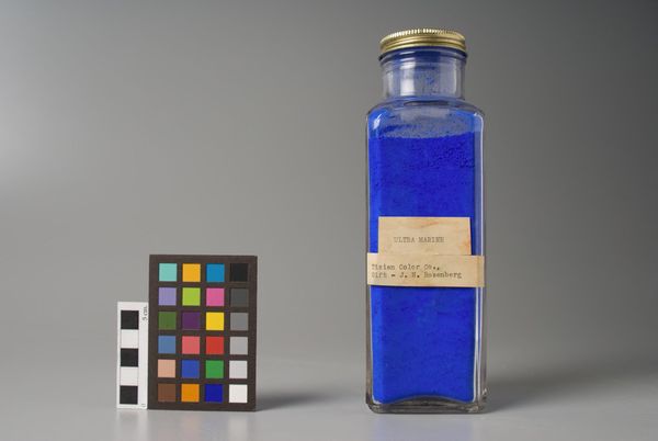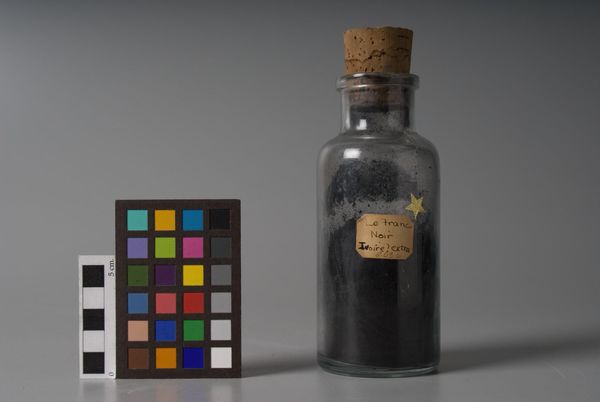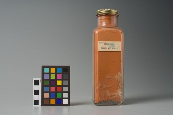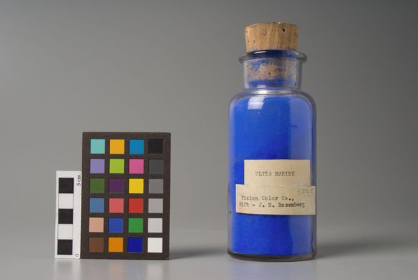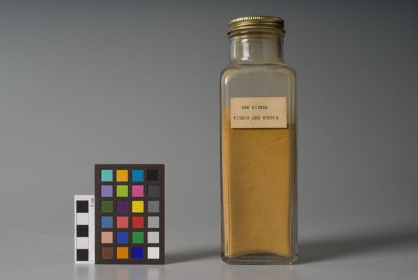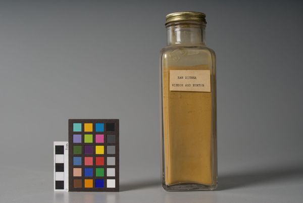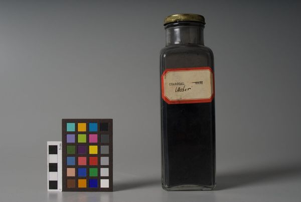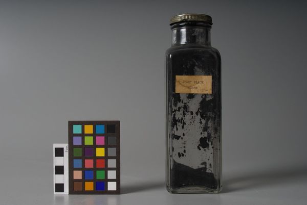 Editor: Here we have "Lamp Black" by Tizian Color Co. It's…well, it's a bottle of pigment! There’s something quietly intriguing about the objecthood of art materials. What do you see in this piece, beyond just black powder in a jar? Curator: It's like looking at the potential for infinite darkness, isn't it? A raw material, holding the promise of shadows and depth. It makes you wonder about all the paintings that began with something as simple as this, and the old lamp whose soot made it. Is it a painting in potentia? Editor: That’s a cool idea. So, it's about what it *could* be? Curator: Exactly! Or even what *was* created with it. A little like holding a universe in your hand, wouldn’t you say? Editor: I never thought of pigment that way. I guess it's more than just a color. Curator: Precisely! It's a history, a possibility, a touch of the infinite made tangible.