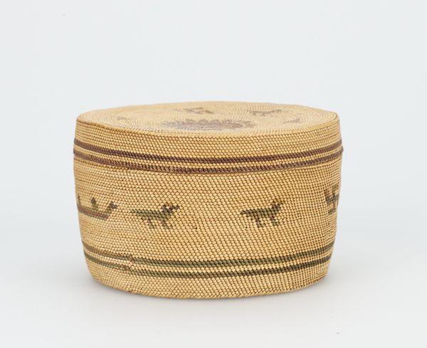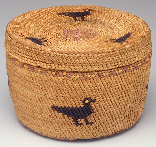 This miniature basket was woven by a Tohono O’odham artist; it has a lid and is made with natural materials. I love how the entire object seems to be built from a single, spiraling line. It's the same repetitive gesture coiling around and around that gives the basket its form. The figures that adorn the basket feel almost like a secret language. There is a figure in a reddish-pink colour holding hands with a darker brown figure. The colours are made by using darker, thinner pieces of reed or grass in the woven surface. There’s something so tactile about this little container. You can imagine how the weaver’s hands moved as they coiled the materials, adding new layers. It reminds me of the work of Sheila Hicks, who also uses thread and fiber to create these tactile objects. It’s cool how the artist's hand is evident, and also how it exists as something beyond our own understanding.