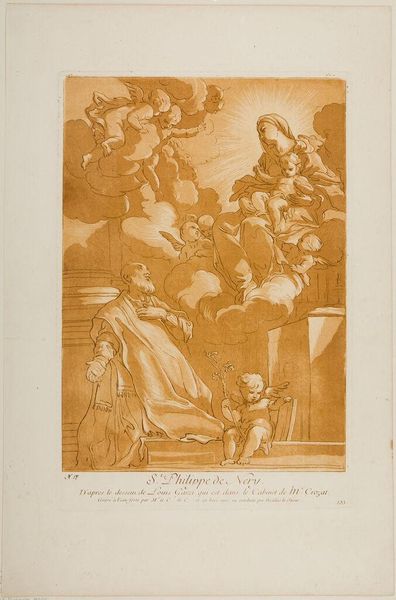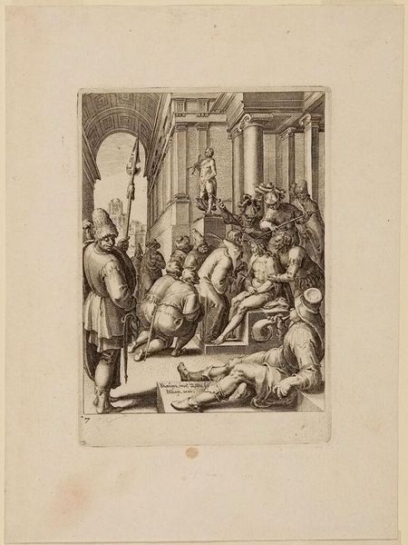 Curator: This is A. Claude Philippe de Thubières, comte de Caylus's "Emperor Henry IV at the Feet of Pope Gregory VII." It's a striking image of power dynamics. Editor: It's a pretty raw depiction, isn't it? The stark contrast between the kneeling Emperor and the seated Pope is quite arresting. You can almost feel the cold stone under Henry's knees. Curator: Absolutely, and the artist captures a pivotal moment in the Investiture Controversy—a power struggle between church and state. The etching itself becomes a material record of these tensions. Editor: Interesting, considering the etching and engraving process. There's labor involved in this act of creating propaganda; in this image of submission, there's a making of power. Curator: Exactly. The printmaking medium allows for wider dissemination of this visual statement, shaping public opinion. And the inclusion of the scene behind further emphasizes papal strength. Editor: Indeed, from a production standpoint, the choice of etching allows for fine lines and details, driving home the emotional weight. It's a manufactured image for a specific audience. Curator: It’s a fascinating intersection of political agenda and artistic execution. Editor: Right. Makes you think about who controlled the narrative—and the means of its creation.