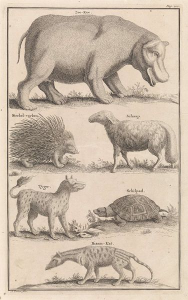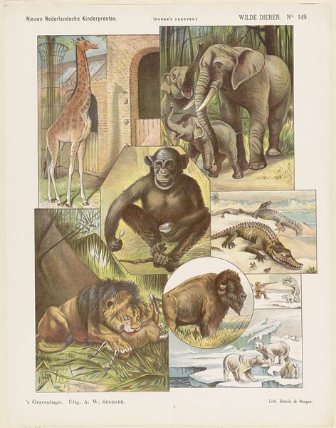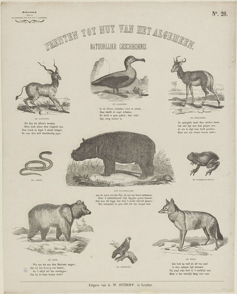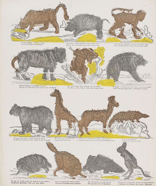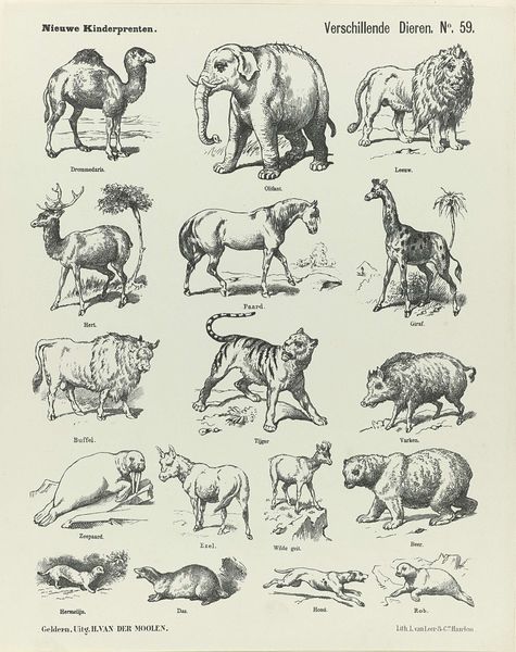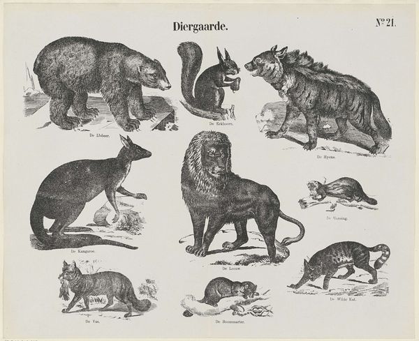 Editor: This print, "Diergaarde," created around 1873 by De Ruyter & Meijer, presents a fascinating collection of animals rendered in ink and engraving. It has such a wonderful educational poster vibe to it, reminding me of old biology textbooks. How would you interpret this work, given its illustrative nature and choice of animals? Curator: It’s interesting that you mention the educational aspect. Think of how potent images of animals, real or imagined, were for conveying symbolic meaning back then. These weren't just representations; each animal held layers of cultural associations. What about these animals resonates most with you? Editor: Well, the tiger feels the most loaded, perhaps because it's so overtly symbolic of power and danger. But even the more mundane creatures, like the bear and wolf, have these deeply embedded narratives around them. Curator: Exactly. These depictions are drawing upon centuries of animal allegory. The lion, for instance, always signals royalty and courage. The wolf might signify both cunning and guardianship, depending on the cultural context. Does that shift your perspective on this collection as a whole? Editor: Definitely! I hadn’t considered how the selection itself creates a narrative, highlighting particular virtues or vices through this collection. Curator: The artists were, knowingly or not, channeling these collective understandings and emotions tied to those animals, which in turn became embedded in art itself, and then perpetuated by images like this. Editor: It is amazing to think about how our present understanding of the world has evolved, being based on perceptions filtered through a series of lenses that reach so far into the past. Thanks so much! Curator: It was my pleasure; noticing is at the very beginning of everything that is good in this world.