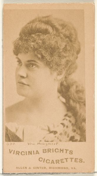 This is a cigarette card of Marie Jansen, from the Actors and Actresses series made by Allen & Ginter. Marie Jansen gazes to her right with a look of tranquil pensiveness. This pose, with the subject's face turned slightly away, has a long lineage, echoing classical representations of muses or goddesses in antiquity. We see this pose frequently in Renaissance portraiture, conveying both beauty and intellectual depth. Consider Botticelli’s Venus, the turn of her head reminiscent in its delicate grace. Over time, this subtle shift in gaze evolved, becoming a conventional symbol of feminine allure, often used to draw the viewer in. This image is a palimpsest of cultural memory, showing us how certain gestures and poses are subconsciously re-enacted across centuries and through different media. The turn of her head is more than just a pose, it is a window into how we perceive and remember beauty.