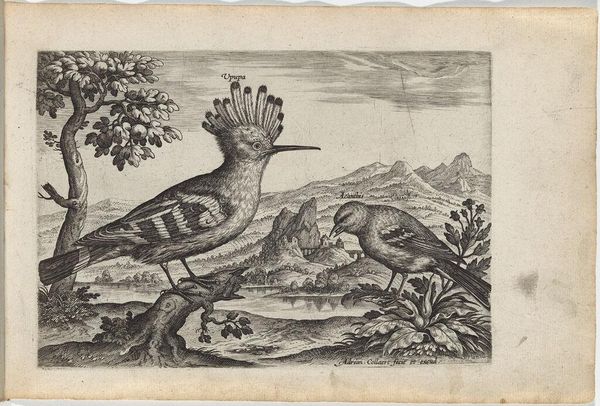 Editor: This is Adriaen Collaert's "Halcyon and Herron," an undated print held at the Harvard Art Museums. The intricate lines depicting the birds and landscape are really striking. What stands out to you about this piece? Curator: Consider the labor involved in this detailed engraving. The copperplate would have been meticulously worked. How might the cost and availability of such prints impact who had access to representations of the natural world? It democratizes it, somehow. Editor: That's a great point. It makes you wonder about the role of prints in disseminating knowledge and shaping perceptions of nature back then. Curator: Precisely. And what about the commodification of nature implied by the printing process itself? This was as much about commerce as it was about art. Editor: I hadn't considered that, but it's fascinating to think about how economics and art are intertwined, even in something that appears to be a simple depiction of birds. Thanks!