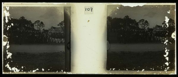 This is a small glass slide depicting boats on a river, made by Theodoor Brouwers. The composition is neatly divided, presenting a scene where the horizontal lines of the boats and river dominate, offset by the verticality of the trees in the background. This arrangement creates a visual rhythm, a push and pull between stillness and motion, that draws the eye across the frame. Brouwers uses light and shadow not just to depict form, but to articulate space. Notice how the contrast enhances the textures of the wooden boats. The use of a photographic slide introduces a level of mediation. What does it mean to capture a scene and present it through this medium? It invites us to consider not just what is shown, but how the act of representation shapes our understanding. The photograph invites us to reflect on how we construct meaning through images.