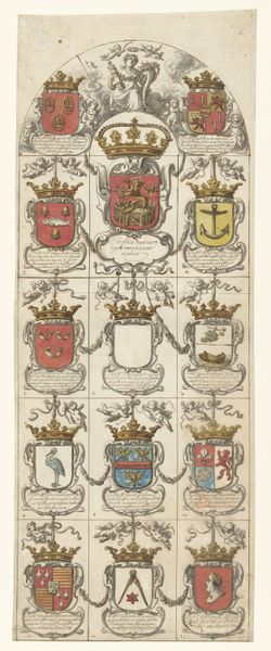 Editor: This is "Ontwerp voor glasraam zes voor de kerk te Oudshoorn," a design for a stained-glass window in the Oudshoorn church, created by Pieter Jansz. between 1663 and 1667. It's an ink drawing on paper and includes so many heraldic elements. It feels incredibly ornate, and yet seems like something more utilitarian. What's your take on this piece? Curator: Looking at this drawing through a materialist lens, it's crucial to consider the socio-economic context of its creation. Stained glass was a costly medium, predominantly commissioned by wealthy patrons or institutions like the church. Who paid Pieter Jansz? The drawing itself, the paper, ink – reflect a network of trade and resources. It embodies status and power, doesn't it? Editor: Absolutely! It wasn’t simply an act of artistic expression but relied on the support and finances of patrons, or in this case possibly donors from a local merchant class or aristocratic family. Is it the function of the drawing, or of the planned window, which is more relevant to your reading? Curator: Both! This drawing exists as a preliminary stage in the manufacture of stained glass, mediating design between artist and craftspeople who would eventually produce it. That divide interests me. Think of the division of labour inherent in the commissioning, design, and production. These aren't just images; they are products of specific processes tied to labor. Editor: I see what you mean. So, it is a confluence of artistry, economy, and labor. Viewing the piece in this light really unveils deeper layers. Curator: Exactly! By questioning the production methods, materiality, and social interactions of art, we go beyond aesthetics to address broader cultural themes in play. Editor: Fascinating. This reframing allows one to appreciate not just the finished piece but all of its production's contributing elements. Thanks so much for the perspective. Curator: My pleasure, it enriches our own perspectives too, doesn’t it?