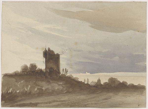 Editor: This is John Varley's "Harlech Castle," a watercolor piece. It’s incredibly evocative; the castle looms on the horizon, a stark reminder of power and the passage of time. What can you tell me about this work? Curator: Considering Varley's historical context, I see this as a commentary on British identity. The castle, a symbol of past conquest and control, is rendered almost melancholically. How does this resonate with contemporary conversations about colonialism and national identity? Editor: So, it's not just a pretty picture, but a prompt to think about the weight of history? Curator: Precisely. It makes us consider the narratives we tell ourselves about who we are and where we come from. Editor: That gives me a lot to think about. Thanks! Curator: My pleasure. I'm glad we could delve into the artwork together.