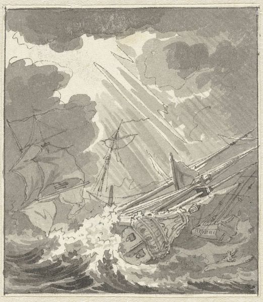 Curator: Look at this churning ocean. It makes you feel delightfully small, doesn’t it? We’re looking at “U.S. Ship of the Line in a Gale,” a print made in 1847 by Nathaniel Currier, capturing a vessel in the throes of a powerful storm. Editor: That's some seriously rough weather! All that rendering of water… But it seems oddly romantic, this dance of man and machine versus nature. There's something gutsy in this. I am just unsure about the printmaking medium, though. Is it about reproducibility for a broader market appeal, or something else? Curator: Oh, absolutely broader appeal, think of it! Currier saw a market need, didn’t he? Suddenly, a sweeping historical drama, captured with great drama—a symbol of American fortitude itself, reproduced and made available to a much larger population than the traditional art market ever could be. I'd bet they felt inspired by the ship. Editor: And of course, that mass distribution makes it such a potent tool for shaping public opinion, fueling patriotic sentiments... It's about more than just aesthetics; it’s about making national identity consumable, like sugar, textiles, or even metal. That’s what industrialization enables. Curator: Precisely! Look how the light catches the tops of those crashing waves, such lovely luminescence despite the ferocity of the gale. Those lines speak of the awesome power that cannot be ignored by either the people in the ship or the nation it symbolizes. Editor: Still, while I admire the intention, there is always an interesting labor contradiction with prints like this: it is always idealized imagery that relies on less glamorous realities in factories that exploit worker's expertise. Something to think about, at least. Curator: An interesting tension, to be sure! So, here is a ship, braving the storm, but supported by laborers producing reproductions for a wider audience. A nation made both visible and accessible by this art in print, where many could reflect on its meaning. Editor: Indeed. I keep thinking about those waves, too, the material conditions needed for it to be seen by more people; the water carries the boat and carries it out of obscurity—which ultimately is reproduced and endlessly distributed! So there is our reflection, always something under the surface waiting to be brought to the top!