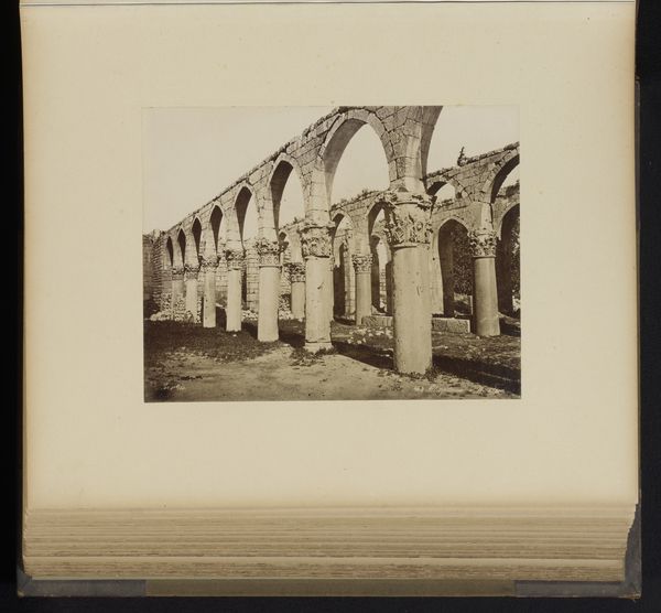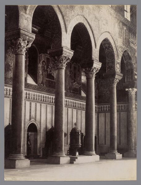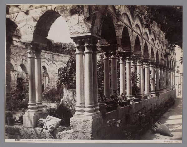 Curator: This print, dating roughly from 1857 to 1914, offers a view of the cloister of Monreale Cathedral in Sicily. It's attributed to Giorgio Sommer and held here at the Rijksmuseum. What strikes you about it? Editor: The rhythm, primarily. The play of light across the repeated arches and columns creates a powerful sense of depth and order. There is such interesting geometry present throughout the building elements in the space, a mathematical ratio found only in nature is exemplified, such beautiful harmony is communicated. Curator: Indeed. Considering that architecture, and especially religious spaces, can be seen as reflections of power structures, how does this Romanesque space from Monreale strike you? Editor: In many respects it embodies, quite literally, the hegemonic structure that produces architecture as a cultural artifice. But I want to unpack what it means to perform religious architecture; how did the Norman-Byzantine identity contribute to or challenge coloniality and social hierarchy here in Sicily? Curator: Absolutely. Sicily, especially in the medieval period, was a crossroads of cultures. Sommer’s photograph captures the Arab influences too, integrated with Christian art and Byzantine mosaics. Consider how the play of shadow emphasizes the material substance. Editor: Yes, the contrast amplifies that aesthetic of solidity. Each structural element makes a statement through material choice; we might decode it, and arrive at new understandings of visual syntax as a sort of silent power dynamic. I am thinking of Foucault and "The Eye of Power" theory when viewing this photographic rendering. Curator: The photographer captures not just the architectural form but also something about the historical moment of encounter between these empires. It’s a place that was influenced and impacted, generation after generation, with the weight and legacy of empires across the water and over land, impacting society. Editor: It reminds me that every column and arch carries embedded codes. To what extent do these symbols influence us as viewers, and what implications exist if we begin to understand how material language impacts subjectivity? It gives me a feeling of wonder thinking of these dialogues of influence in an ancient religious institution that's rendered so carefully in the captured medium of photography. Curator: So, this print then shows us a great intersection: culture and history; colonialism and power; even photography and architecture intersect with social history. Editor: Precisely! The piece inspires so much deeper thinking that's far more rich than simple art history.