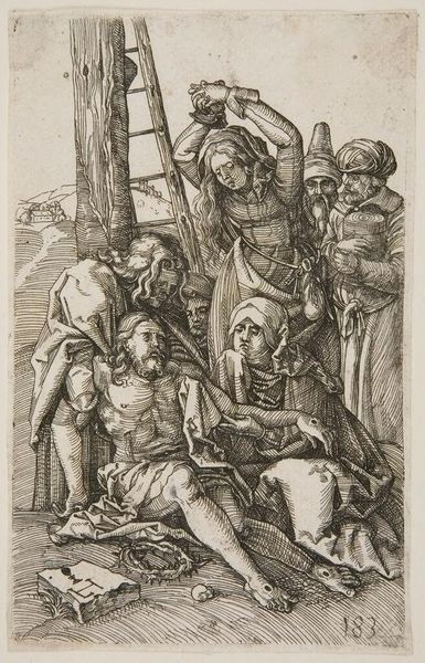 Curator: Editor: This is "Two warriors, one seated on a low foreground rock…," an etching by Salvator Rosa. The detail is incredible! I’m immediately struck by the tension in the image; it feels like a moment of contemplation before or after battle. How do you interpret this work? Curator: The tension you perceive resonates with the complex historical context of the Baroque period, marked by religious and political upheaval. The figures, seemingly powerful warriors, appear vulnerable, hinting at the psychological toll of conflict. Rosa often used such imagery to subtly critique power structures. Editor: That's fascinating. I hadn't considered the political implications. The body language is quite telling, isn’t it? One warrior sits above, but the other looks up with an almost pleading expression. Curator: Exactly! Consider the power dynamics embedded in the composition. Who benefits from these conflicts, and who bears the brunt? Are these men equals or does one hold authority over the other? Editor: Now that you mention it, there’s definitely a class dimension visible in their attire. Curator: Precisely! Rosa frequently used his art to address themes of social inequality and the human cost of ambition, particularly pertinent during the tumultuous era of the Thirty Years' War. What else do you notice? Editor: I guess I just saw them as stoic heroes initially. Now I see a more critical message about the realities of war, and the ways in which societies justify violence and inequality. Curator: Rosa challenges the glorification of warfare by foregrounding individual psychological states. Understanding Rosa's drawing through this lens gives us a different insight into art, not as pure beauty, but as commentary. Editor: It really shifts my perspective on the piece and Baroque art generally. I thought it was about religious themes! Curator: It often layers religion, mythology, and power with subversive themes. History and contemporary society are inseparable. Editor: Absolutely, thank you for pointing that out; I'll have to revisit other pieces I thought I knew and start over! Curator: An art education is a lifelong act of 'starting over'!