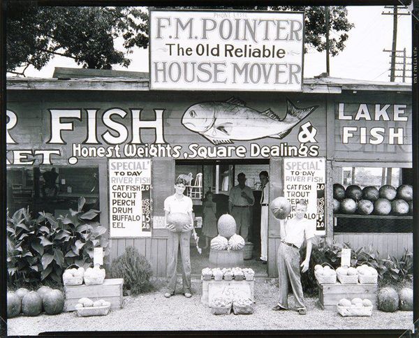 Curator: This captivating photograph is Robert Frank's "Fruit stand--San Fernando, California," created in 1956. What are your immediate impressions? Editor: The immediate feel is dusty. It's incredibly flat, compositionally; a low-contrast image bleached by the California sun. The repeated horizontals and rectangles almost flatten the fruit stand, despite it obviously being a three-dimensional structure. Curator: Interesting observation about the "flatness." The repetition of rectangular shapes—the signs, crates, shelves—creates a visual language here. How do those shapes speak to you? Editor: Well, rectangles denote order, containment. But, in the context of this fruit stand and billboard promising “juicy fruit”, these rigid shapes feel like an attempt to impose order onto something naturally chaotic and perishable. Look at the signage looming in the background, suggesting a promise that is unnatural or hard to believe. The ideal face doesn’t seem to fit with the mundane reality, a sharp contrast to the photograph’s realistic style. Curator: It’s a wonderful jumping-off point for talking about realism, indeed, or the lack thereof in the symbolism of 1950’s Americana. Tell me more… Editor: Well, juxtapose the woman's stylized face on the advert to the street photograph. It speaks volumes about manufactured desire versus lived experience, in addition to an almost unbearable artificiality…almost a dark irony present within something we naturally want and crave—juicy, delicious, natural food. It becomes corrupted within the context. The apples, bananas, and grapes hint at the cornucopia myth and contrast, starkly, the dusty terrain on which they exist. Curator: Your insights really amplify Frank’s exploration of the American experience! Did the repetition, flatness, or even the fruit depicted, affect your perceptions or overall impression in other ways? Editor: Overall, the photo emits a strange feeling of disappointment—a visual representation of dreams deferred within consumerism. It asks more questions than it answers, and leaves me strangely hollow despite all the symbols. Curator: I concur; Robert Frank manages to construct a tableau that reveals, as much as it conceals, something quite profound within the familiar American landscape. Editor: Indeed, revealing a tension humming beneath the surface. A potent image for any era to explore.