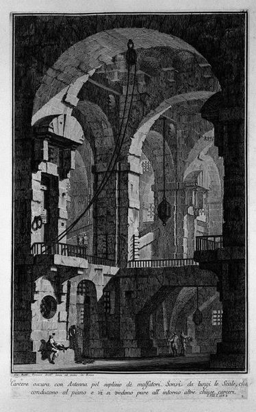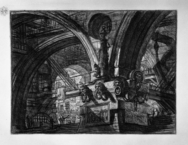 Curator: This etching is entitled "The Round Tower." The artist is Giovanni Battista Piranesi, famed for his dramatic architectural fantasies. The medium itself, etching, lends itself perfectly to Piranesi's vision. Editor: My initial impression is… dizzying. The scale is immense, yet the detail is intricate, pulling me in even as it overwhelms. It feels almost nightmarish, a grand architectural prison. Curator: Indeed. Consider the labor involved in creating such detail in a print. Each line, each shadow, carefully etched into the copper plate, multiple stages of biting with acid... it speaks to the immense effort put into representing a world that ultimately only exists in Piranesi's imagination. Editor: And it's an imagination clearly rooted in the socio-political anxieties of its time. These are not functional buildings; they're expressions of power, bureaucracy, and perhaps a sense of being trapped within the systems humanity creates. Think about how Piranesi, an Italian artist working during the Enlightenment, would have viewed the institutions of his era. Curator: Exactly! We need to remember the availability of materials. The rise of copper mining and advancements in printmaking made such detailed reproduction more accessible, fuelling a market for these grand, imaginative cityscapes that played on people's aspirations and anxieties. Also, the contrast between the permanence of the architectural subject and the ease in which the art medium can be transported highlights its own societal position. Editor: The architectural details themselves, the soaring arches and impossibly winding staircases, create a sense of oppressive grandeur. These structures appear to dwarf the figures that populate them. The architecture embodies themes of political domination; with no real sense of what labor is producing. This reminds the viewer of power through grand scales and a celebration of architectural progress and power. Curator: I'm fascinated by how he manages to render the texture of stone. By using different etching techniques to evoke light and shadow, but ultimately that effect of realism is only successful on this mass produced print because the original artwork contained it. Editor: In a way, this image highlights the limitations and contradictions inherent in any grand architectural project undertaken in Europe during the age of enlightenment. The print becomes a vehicle to deliver architectural dominance with political agendas. Curator: Absolutely. It’s an invitation to contemplate the complex relationship between ambition, technology, and the society. Editor: I agree. And how visual language serves to embody themes such as: control, fear, and aspiration.