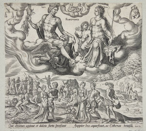 Curator: Let's consider this 1563 engraving by Philips Galle titled "Satan challenging the Lord to remove his protection from Job," currently held at the SMK in Copenhagen. The scene feels incredibly tense, even theatrical. Editor: I see a carefully constructed composition; a dramatic dance almost entirely crafted of tonal gradients. The medium itself, engraving, suggests a labor-intensive, and controlled process. It makes you wonder, what was the workshop that created this like? Curator: Absolutely. And if we consider the socio-political context of Mannerism at this time, the stylistic choices and the very themes explored in Galle’s print begin to speak volumes. The story of Job, after all, tackles questions of faith, suffering, and divine justice at a time when religious reformations were shaking European society. The very visual style, mannerism, emphasizes the very artificial nature of representation that reminds us that faith is being visually constructed by outside, powerful figures. Editor: Interesting point. This piece obviously aims to instill faith into a large audience, yet I think it could easily encourage more open interpretation of its story. And yes, this level of intricacy doesn’t just *appear*. It is an industrialized print for consumption; someone had to translate theological anxiety through skilled craft labor. There is this clear push and pull between this detailed production and what is being promoted, that is certainly revealing. Curator: The engraving format allowed the wider circulation of images that served very particular functions: reinforcing moral norms or conveying social ideals, even critiquing them in allegorical ways. This particular scene presents us with a confrontation: a seemingly vulnerable humanity threatened by a powerful Satan and overseen by an unyielding God. Editor: This contrast highlights the human body – that itself has become an aesthetic object of study– rendered in ink on paper through what you astutely noted, are particular aesthetic norms! To create art like this is itself, at times, a form of resistance to certain religious orthodoxies because the artistic practice often leads to broader interpretations. Curator: Viewing Galle’s “Satan challenging the Lord” provides a stark visual narrative deeply rooted in a period grappling with social and theological shifts. Through allegory, Galle’s art subtly opens questions, even critiques power dynamics within his contemporary world. Editor: Agreed, and in a piece like this, seeing the intersection of skilled labour, available material and consumer demand can itself show us something else about the relationship between making, power, and belief.
