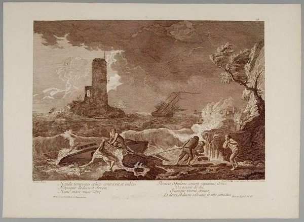 Curator: Here we have "Fishing with Nets" by Pellegrino dal Colle, who lived from 1737 to 1812. Editor: It's a monochrome scene, very stylized, almost theatrical. The contrast between the dark, looming sky and the light figures creates a dramatic tension. Curator: Precisely. The nets themselves could symbolize entrapment or even providence, depending on the viewer's perspective on labor and nature. Editor: And the waterfall and mountain backdrop suggest a Romantic sensibility, a kind of sublime power beyond human control, but the figures are elegantly posed within this wildness. Curator: Yes, the figures draw on classical archetypes, imbuing the everyday act of fishing with a kind of timelessness. Editor: It makes you think about how we understand the relationship between labor and natural resources through imagery. Curator: Absolutely. Each viewer is likely to find their own personal connection to this image. Editor: It certainly prompts you to consider the visual and symbolic layers present in this artist's vision.