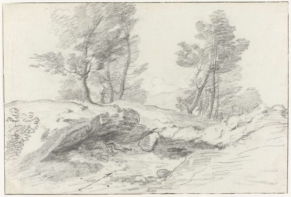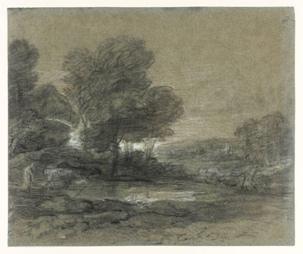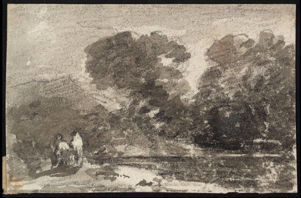 Curator: Before us, we have Cornelius Varley’s "Landscape Composition: Pastoral," currently residing in the Tate Collections. Editor: It feels rather somber, doesn't it? The muted tones lend the scene a quiet melancholy. Curator: Absolutely. The pastoral tradition is often associated with idealized leisure, but here, there's a palpable sense of the workers' weariness, reflecting perhaps the realities of agricultural labor in the 19th century. Editor: And the stark contrast between the dense charcoal and the paper's surface emphasizes the materiality of the artwork itself; you can almost feel the texture. The means of production, the charcoal itself, speaks to the earth and the labor extracted from it. Curator: Precisely. Varley gives us a glimpse into the complex relationship between human figures, landscape, and the socio-political context of labor. Editor: Indeed. It’s a reminder that even seemingly idyllic scenes are often steeped in the realities of production and consumption.