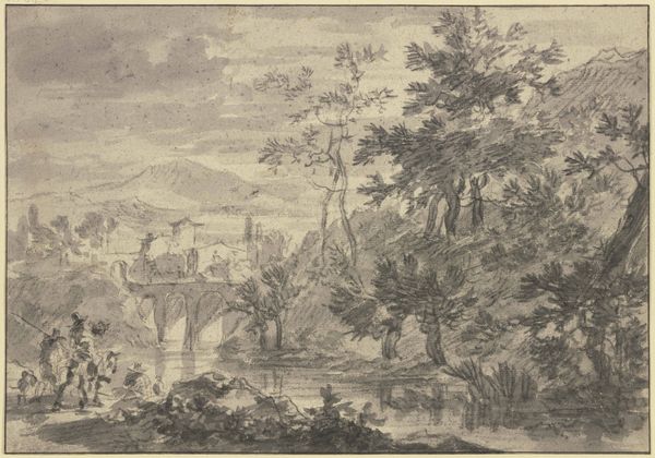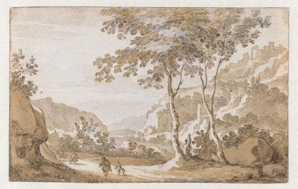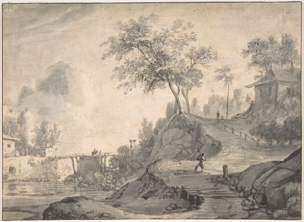 Curator: This drawing, "After Both," comes to us from the hand of Thomas Sunderland, who was active in the late 18th and early 19th centuries. It resides here at the Tate Collections. Editor: It has a very subdued, almost melancholy feel. The palette is so restrained; it's as if the scene is viewed through a layer of time itself. Curator: Looking at the figures, it seems like a commentary on labor and travel, the everyday movement of people and goods in a pre-industrial landscape. The scene feels almost staged, idealized. Editor: The lack of color and the quick, almost impatient linework really emphasize the basic materials. Ink on paper. It’s a very immediate process, isn't it? Stripped of any embellishment. Curator: Perhaps Sunderland is reflecting on the social stratification inherent in rural life, hinting at the disparities between those who travel and those who remain rooted in the land. Editor: It makes me wonder what kind of paper and ink were available to him, and how that affected the final product. Curator: Ultimately, I am reminded that art can be a mirror, reflecting our own biases and assumptions about the past. Editor: Indeed, thinking about Sunderland’s own access to materials really makes me consider how our understanding of art history is shaped by access and opportunity.