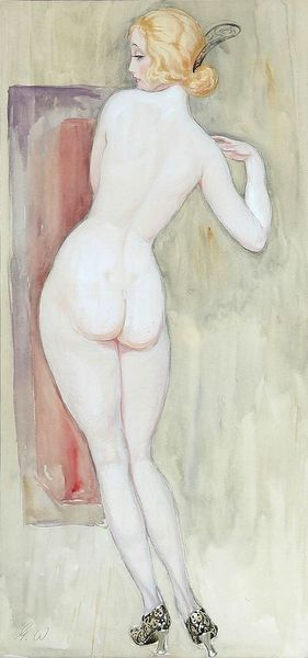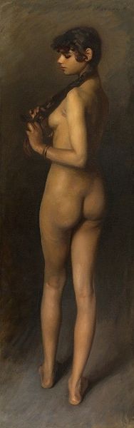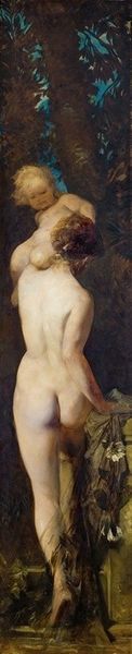 Editor: Here we have Anders Zorn's "Model Study" from 1879, created using oil paint. I'm struck by how realistic the figure is, but the background seems much looser, almost unfinished. What aspects jump out to you in this piece? Curator: The interesting thing to consider here is not just the image *of* a body, but how the body *as labor* figures into the whole endeavor of academic painting. How many hours did this model stand, under what conditions? We're so often presented with the finished product, that the material conditions that are actually involved in the making are obscured. Editor: So, it's less about the final image and more about the act of creating it? Curator: Precisely. Consider the layers of oil paint, built up over time, and what those material choices and application techniques tell us about artistic production during this period. This wasn't a fleeting impression captured en plein air, this was a sustained process requiring bodies in specific conditions, laboring, under capital's demand to generate art objects. Look at the way the brushstrokes create not just flesh, but an object of study, and the implications of the model as a worker, as flesh made product. Editor: I hadn’t considered that at all, how the act of *making* the art is almost as important as the art itself. Curator: It really pushes you to think about the socio-economic circumstances involved. Do we know the models' compensation, the space itself, heating or lighting conditions, any number of environmental concerns regarding the process. The labor and commodification aspect really does reframe how we think about beauty or expression in traditional painting, wouldn't you agree? Editor: Absolutely. I'll never look at a nude study the same way again. It’s all about the human and material cost behind it.