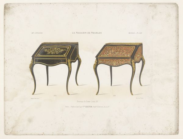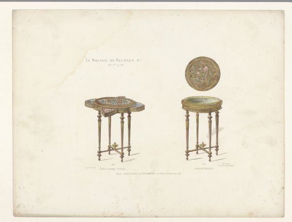 Editor: We're looking at "Drie bijzettafels," or "Three Side Tables," a print from somewhere between 1885 and 1895, probably a lithograph from Lèon Laroche. What I find most striking is the precision in rendering the furniture’s details and their symmetrical quality. How do you interpret this piece from a formalist point of view? Curator: Well, I’m immediately drawn to the print's arrangement and the delicate balance between line and form. Note how the linear precision defines the contours of each table, setting a distinct rhythm. What stands out to you in their composition? Editor: I think their geometry is so diverse. I see circles, straight lines, rounded corners – a playful interaction between shapes that make them feel less rigid, even though they depict furniture. What about color? How does that fit into formal analysis? Curator: The use of muted colors helps maintain focus on form, but notice how the tonal variations contribute to the dimensional rendering of each table. Do you see how the subtle gradations of color emphasize the object's materiality? Editor: It's true, the understated color scheme emphasizes the fine lines of the rendering. And actually, now I can see that each object, distinct in shape and ornamentation, possesses a different visual tempo, revealing different structural relationships that work as a harmonious group of geometric forms. Curator: Exactly. Now you're engaging with its structural and compositional strategies as an intellectual puzzle! This kind of analytical dissection opens us up to a richer engagement with the artwork itself.