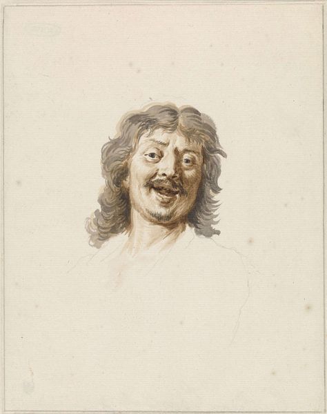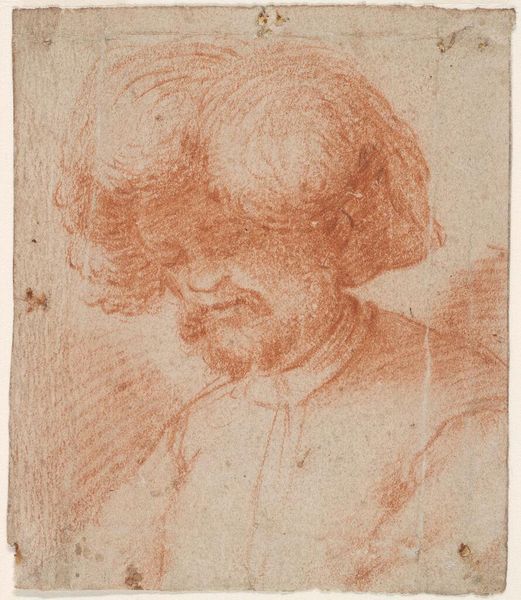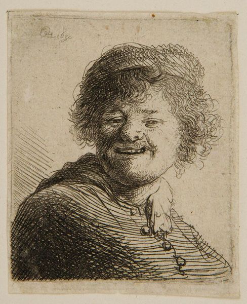 Curator: Here we have Rembrandt van Rijn's "Self-Portrait with Long Bushy Hair: Head Only" from the collections of the Harvard Art Museums. Editor: It's a very intimate image; the face seems etched with a world-weariness. Curator: Indeed, and crafted meticulously via etching. The lines, the very material of the print, seem to define his psychological state. There's a tangible link to Rembrandt's labor in each stroke. Editor: The hair, wild and unkempt, acts as a halo of sorts, a symbol of his artistic genius perhaps, or maybe a nod to his inner turmoil. Curator: Or simply how his hair looked that day. It’s about recording the physical realities of his existence. Editor: Fair enough, but the tilt of the head, the somber eyes...it speaks to the weight of existence. Curator: An existence, we must remember, defined by the demands of the market and the availability of materials. Editor: I see the man looking back across the centuries. Curator: And I see the means that allowed him to do so. Editor: A fascinating intersection, then, of tangible craft and intangible spirit.