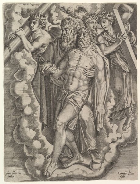 Editor: Here we have Gian Jacopo Caraglio's "Allegory of Wrath," a fascinating intaglio print from the 1520s or 30s. It feels like a descent into madness, a swirling composition that overwhelms me a bit. What symbols or recurring motifs do you find particularly striking here? Curator: Well, the writhing serpents are hard to ignore. Think about the serpent's long history – from the Garden of Eden to Asclepius' staff. It is a complex signifier: representing healing, destruction, temptation, wisdom. Note how Caraglio employs the serpent to visualize wrath’s insidious, choking power, not only coiling around figures, but seemingly *becoming* the very fabric of the environment. Editor: It definitely adds to the claustrophobic feeling. Is the serpent the main allegory here? Curator: It's one of several interlocking symbols. Consider the central figure: gaunt, contorted, seemingly consumed from within. Note the figure is astride the bestial creature—the source of the rage. And the swan, awkwardly placed—does it offer an escape? An alternative to the poisonous rage all around? Caraglio is layering meaning here, demanding that we decode it. How do you interpret the central figure's physical state? Editor: The emaciated body really emphasizes the destructive nature of anger. Like it literally consumes you. It's a powerful image, though unsettling. The swan provides a contrast; a symbol of purity? Curator: Precisely! It introduces a counterpoint, a whisper of potential salvation amidst the chaos. Think about it--Mannerist artists often embraced complex allegories. What does this tell us about cultural anxieties and ideals in that period? Editor: I see! It makes you think about the personal struggles everyone was experiencing at that time, reflecting social and religious change. Thank you. Curator: Absolutely, and looking at art this way, through its symbols and cultural echoes, gives us insight into not only the art but into the society and time period in which it was created.