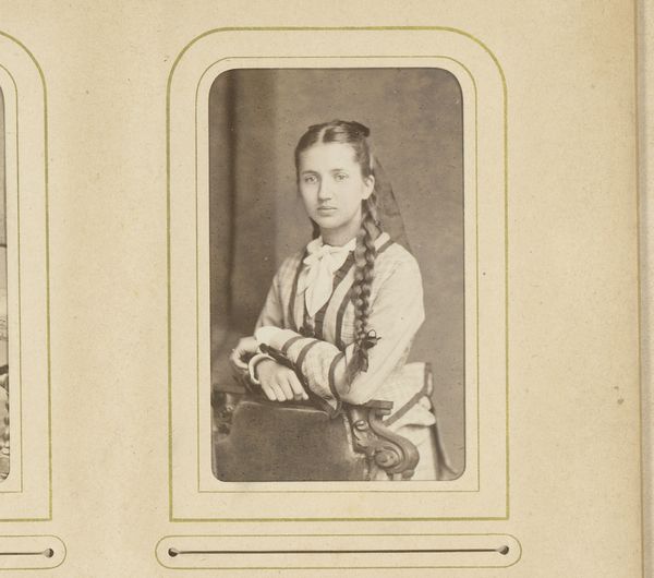 This is a photograph by Friedrich Julius von Kolkow, titled "Portret van een staande vrouw bij een stoel" or "Portrait of a standing woman by a chair". Although undated, this image reflects mid-19th-century values in Prussia. Photography was becoming more accessible, yet portraiture retained an aura of formality. This woman's somber dress and restrained pose speak to the era's emphasis on modesty and decorum. The chair, a common studio prop, subtly implies status and refinement. Consider the institutional context: why was this image created? Was it a private memento, or intended for public display? The very act of posing for a photograph was then a self-conscious performance, reinforcing social expectations. By examining fashion trends, photographic practices, and social norms, the historian can reveal how this image participated in the visual culture of its time. Studying family albums, studio records, and etiquette guides can offer a deeper understanding of this woman's world.
