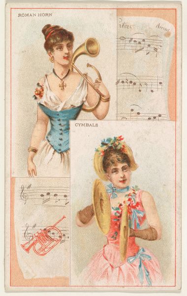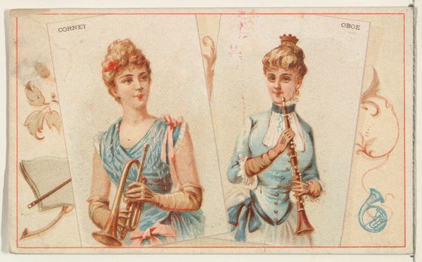 Editor: This is a colorful print from 1888 by W. Duke, Sons & Co., titled "Bassoon and Clarinet, from the Musical Instruments series." It features two women holding their respective instruments. It strikes me as very symmetrical. What do you make of this piece? Curator: Indeed, the symmetrical composition is immediately apparent. The artist employs a clear binary structure, dividing the space equally between the bassoon and clarinet. Note how the verticality of the instruments and organ pipes emphasize this division, creating a visual rhythm based on repetition and mirroring. Editor: So the visual elements themselves are key here? Curator: Precisely. The chromatic scale, while somewhat muted, offers further insight. The bassoon player, with her earth-toned dress and darker instrument, contrasts with the clarinet player in lighter, more vibrant pastels. This chromatic opposition contributes to the overall structure, highlighting the distinct qualities of each instrument, perhaps even alluding to their contrasting timbres. Observe also how the decorative floral patterns on their garments serve as repeated visual motifs. Editor: It's interesting how much information is conveyed simply through these formal choices, especially given that it was made as a promotional item. Curator: One must analyze the formal strategies employed within the artwork, independent of external influences or interpretations, to apprehend meaning, or perhaps even a subtle commentary on female performance in the late 19th century. Consider the line, the form, and color; are these arranged to create meaning, and if so, how? Editor: I see now how the careful arrangement of colour and form contributes so heavily to meaning in a work like this. Thanks! Curator: My pleasure! I am pleased to offer insights into this beautiful and instructive work.