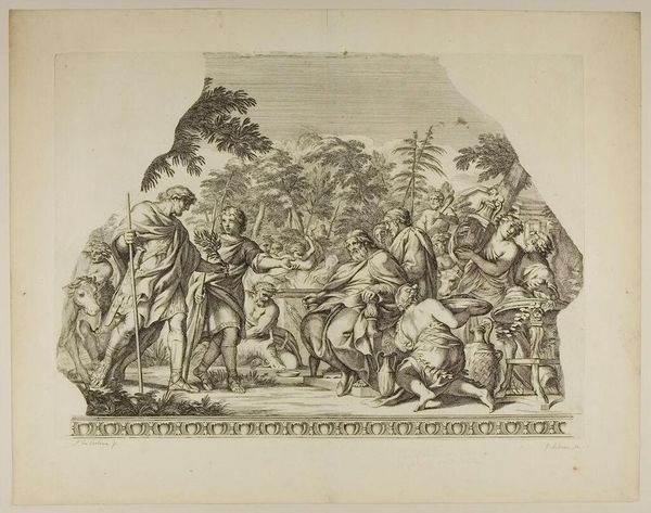 Editor: Here we have Gérard Audran's "Ulysses and the Sirens." I’m struck by the drama of the scene, this precarious balance between order and chaos. What underlying tensions do you see at play in this piece? Curator: I see Audran engaging with a powerful intersectional narrative here. The sirens represent not just temptation, but the silencing of marginalized voices, particularly those of women, through seductive yet ultimately destructive means. Editor: So, Ulysses's resistance is a commentary on… power? Curator: Precisely! His ability to resist, secured by the bonds imposed by his crew, reflects the privileges that enable some to ignore voices deemed dangerous or disruptive. How does that read today? Editor: It definitely adds a layer of uncomfortable awareness to the heroic narrative. I'll never look at this myth the same way. Curator: It's a potent reminder that even classical stories are deeply embedded within systems of power and control.