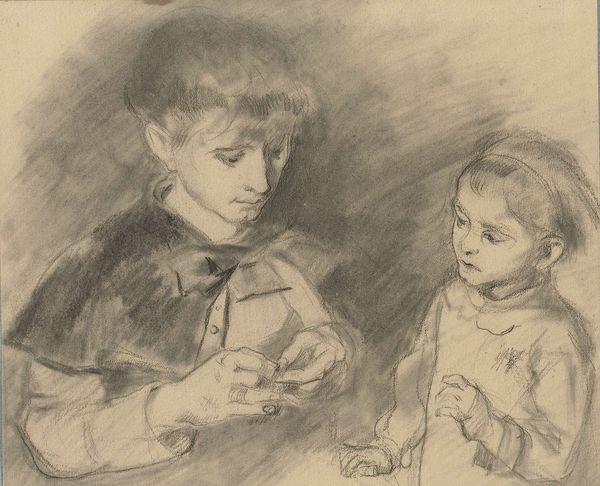 Curator: Alright, let's take a look at Walter Sickert’s "Cat's Cradle," created as a lithograph print on paper in 1892, now held here at the Art Institute of Chicago. It’s an interesting image. Editor: Yes, the mood is introspective, isn’t it? There's a quiet concentration that feels intimate, a glimpse into a private moment. Curator: The choice of lithography certainly emphasizes that feeling. The printmaking process itself democratizes image production – this wasn’t meant to be a singular, rarefied object, but rather one accessible to a wider public. Notice how Sickert used hatching and cross-hatching to suggest form and shadow. Editor: Right, and it’s funny, the cross-hatching kind of mirrors the cat's cradle string itself, all these crisscrossing lines forming a little web. I wonder what that means for Sickert... maybe he’s thinking about how we're all connected, caught in little narratives? Curator: Well, there's definitely a social context here too. The game of Cat's Cradle, so popular in Victorian society, particularly among women, speaks to gendered roles and leisure activities of the time. It involves skill, repetition, and often, shared activity. It's about a sort of controlled crafting, isn't it? Editor: That resonates—like this whole impressionistic period was about the little nuances that really capture people as they are living at the moment. Curator: Precisely. You could argue the impressionistic style, captured here with the softness of the lithographic crayon, allowed Sickert to subtly acknowledge those complexities, showing everyday people doing everyday things. Editor: Thinking about those impressionist and social underpinnings, that tension between simplicity and intricacy reminds me a bit of our own work in editing and curation, how we try to make complicated things more accessible but still nuanced. Curator: I suppose the "trick" is in finding just the right pressure, whether applying a crayon to a lithographic stone or choosing just the right word.