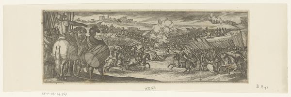 Curator: Here we have Antonio Tempesta’s “Battle Scene with Cavalry and Trumpeter on a Hill,” created around 1599. The engraving depicts a rather tumultuous clash. What’s your immediate read on this work? Editor: A certain dynamic chaos! The stark contrast between the light and shadow creates a dizzying, almost overwhelming feeling. The compressed figures marching into the distance really create a sense of scale, although the composition seems restless, even anxious. Curator: I see your point. Tempesta was operating within a historical context saturated with religious and political conflict. These clashes often shaped artistic output. The detail included suggests a historical interest in accurately portraying the accoutrements of warfare. Do you think this piece is an accurate rendering or an interpretation of military conflict? Editor: Possibly both, but the artist is in fact foregrounding an allegorical statement of militarism. We're seeing how conflict manifests through graphic expression, focusing less on documentation, more on the sheer visual spectacle, if that makes sense? The engraving's technique and sharp line work also lends the historical narrative urgency, it's a call to attention, really. Curator: A fair comment. Focusing on the construction, note how the artist employed engraving to articulate that precise contrast you pointed out. The crispness of the line dictates our reading of each element, no? It delineates man from horse, soldier from terrain. The architecture also seems deliberate, the walls being menaced in the distance. Editor: Indeed, and look at how that hill leads our gaze, but those diagonals keep cutting across. Tempesta forces our eyes to dart from the central group outward, implying that tension will permeate everywhere, from those leaders with the trumpeter right into the background, into the world. That elevated perspective acts like a kind of judgment. The whole composition feels volatile, poised for more. Curator: The details certainly pull us in. What lingers with you most after this review? Editor: I suppose that initial impression of unrest. In isolation the components - horses, hills, soldiers - aren't really disturbing, but altogether there's a kind of organized pandemonium. What do you take away? Curator: The artist's remarkable facility with the engraved line itself. To generate such drama from those formal constraints underscores his vision and execution.