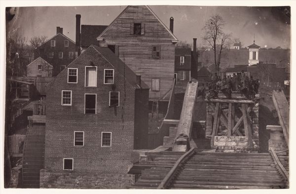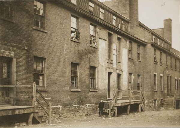 Curator: Herbert Dearden Hope's photograph, titled "Housing, Conditions: United States," captures tenements in Lowell, Massachusetts, reflecting the environment after immigration. Editor: The bleak composition immediately strikes me; the light is flat, almost draining the color from the buildings and figures. Curator: Indeed. Hope’s work highlights the perpetuation of European standards in America, showcasing the housing conditions of immigrant communities, specifically the Turks, Irish, and Poles. It brings into focus the socio-economic realities and challenges these groups faced. Editor: The repetition of the window and chimney shapes creates a rigid structure, perhaps mirroring the restrictive environment. The children in the foreground add a poignant contrast. Curator: The image serves as a stark reminder of the immigrant experience, revealing the struggle for identity and belonging within a new landscape, and questioning the promise of America. Editor: It's a powerful image, undeniably. The formal qualities underscore the somber mood and the implied critique of societal structures.