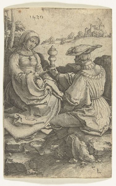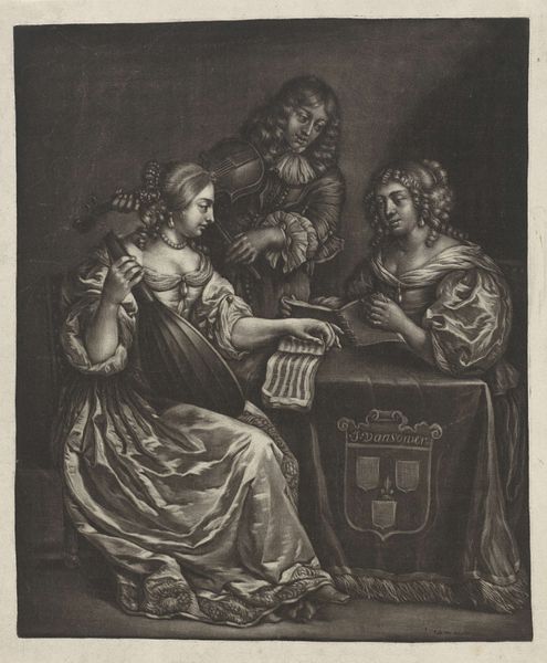 Jan van Somer made this print, "Three Musicians," measuring about 26 by 21 centimeters, sometime in the 17th century. The print depicts the leisure activities of the Dutch upper class. Domestic music-making, for instance, was a common theme in Dutch art, reflecting its increasing cultural and social significance. The print also suggests the institutional role of women. The women depicted are actively participating in the music-making, which challenges traditional gender roles, where women were often portrayed as passive objects. This progressive representation could reflect the changing social norms and the growing prominence of women in the cultural life of the time. To get a deeper insight into this period, one might consult historical records, letters, and other images from Dutch archives. Doing so will reveal how art both reflected and shaped the social norms of its time.