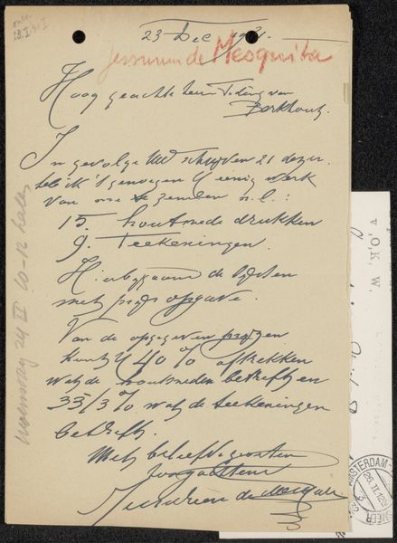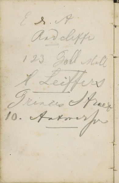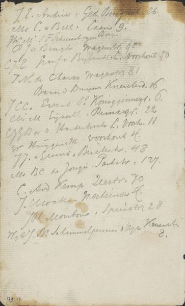 Curator: This drawing, believed to have been created between 1849 and 1895, is titled "Instructie voor het solderen van ijzer," or "Instructions for soldering iron." It comes to us from Willem Koekkoek and resides here at the Rijksmuseum. It seems to be created with pen and ink on paper. Editor: My first impression is one of secrets, perhaps an alchemist’s notes jotted down hurriedly. The calligraphic script feels delicate and precise, yet the stains and smudges suggest a well-used, personal document. It has the feeling of some kind of treasure map! Curator: Precisely! It's a glimpse into a craftsman's practical knowledge, not just a detached set of instructions, it hints at the real-world conditions under which these techniques were used. The very act of writing these instructions transforms the knowledge into a tangible object, a proto-industrial resource. Editor: And what strikes me, visually, are the words themselves. Consider, for example, “Geest van Zout”, spirit of salt! Each element, beyond its chemical composition, is imbued with an ancient association, carrying symbolism far beyond practical instruction. Its linguistic symbols open onto something almost animistic, or sacred, despite its intended purpose. Curator: This tension between the mystical and the practical is what interests me most. Recipes and instruction manuals were valuable resources and carefully guarded secrets passed down from generation to generation or guild to guild, therefore its value transcended economics into realms of community building and knowledge economies. Editor: Absolutely, one senses a continuous link from the medieval guild halls and even alchemy. Though intended for instruction, each element described, salt or “zout,” spirit or “geest,” suggests not simply an act of instruction, but something more personal, more intimate, and far deeper rooted. Curator: Well put. This is much more than a simple recipe; it’s a connection to a world where craft was intimately intertwined with communal knowledge, and a critical ingredient in building the social fabric. Editor: And through this beautiful drawing we can glean echoes of an older order, transformed now into a cultural memory that continues to resonate.