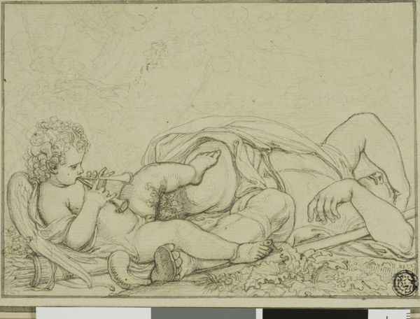 Editor: This delicate drawing, "Reclining Female Nude with a Dog," by an anonymous artist, captures a playful moment. The dog seems to be nibbling at the woman’s toes. What cultural narratives or symbols might be embedded in such an intimate scene? Curator: The image evokes familiar themes – the reclining nude, a long art-historical tradition – but subverts them. The dog, often a symbol of fidelity, here is an unruly participant, disrupting the expected serenity. Is the artist commenting on domesticity, perhaps hinting at the chaos that love and connection can bring? Editor: That's fascinating! The disruption creates a different feeling than I initially perceived. Curator: Exactly. The symbolism shifts as the dog interacts directly with the nude form. It might be exploring how the personal and the public intersect. Now, what do *you* think the artist wanted to convey? Editor: Considering the historical context and the dog as a symbol, I see a playful commentary on domestic intimacy and the shifting roles within it. Thanks for pointing that out! Curator: It's a pleasure to share these insights with you. The beauty of art lies in its layered meanings and the conversations it ignites.