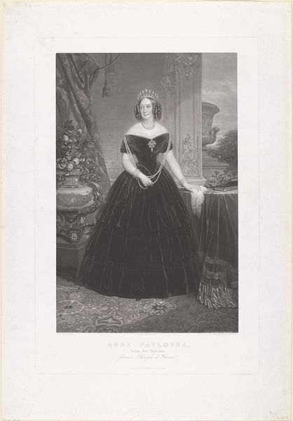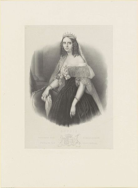 Nicolaas Johannes Wilhelmus de Roode created this portrait of Sophie van Württemberg using lithography. The composition is dominated by a play of textures and carefully distributed light, creating a sense of depth and aristocratic elegance. De Roode masterfully uses the lithographic technique to create a complex semiotic system, with gradations of tone representing not just light and shadow but also social status and moral virtue. The intricate lace and the sheen of the dress function as signs of wealth, while the subdued color palette conveys a sense of decorum appropriate to her royal status. The composition is carefully balanced to give a structured feel, as though she is simultaneously present but also removed by the formality of the portrait setting. Ultimately, it is the lithography itself – its capacity for detailed reproduction and subtle tonal variation – that allows de Roode to create an image that speaks to both the physical presence and the symbolic weight carried by this royal figure. The artwork serves as a fascinating intersection of artistic technique and cultural symbolism.