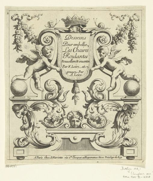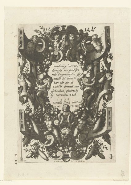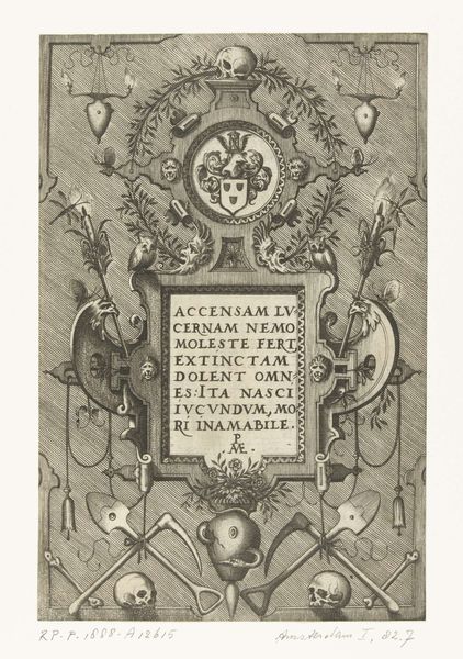 Curator: Before us is a striking print titled "Cartouche in de vorm van een kruis," or "Cartouche in the Shape of a Cross," an engraving crafted in 1556. It’s an intriguing piece of graphic art currently held at the Rijksmuseum. Editor: My initial reaction is one of restrained solemnity. The monochrome palette and precisely etched lines evoke a somber yet formal mood. Curator: The formal structure of the print is crucial. Observe the deliberate arrangement of lines and shapes—the cross format immediately grabs the viewer's attention. Editor: Absolutely, and it's interesting to note how this symbolic shape, the cross, would have been viewed by diverse religious and secular groups during the Renaissance. I’m particularly curious about the text within it; it’s not merely decorative, but clearly meant to convey some wisdom or moral imperative of its era. What is that Latin saying really getting at, especially in this socio-political context? Curator: The Latin inscription certainly invites careful consideration. The lettering is presented with such balance within the central cartouche. Its textual presence adds layers of meaning, serving a functional purpose inseparable from the overall visual impact. We should consider the role of Jacob. Apostle's phrase "If God wills" here. Editor: Thinking about its functionality, beyond the inscription itself, how did this image likely circulate? Was it part of a larger publication? Knowing its intended audience and the spaces it inhabited allows us to imagine how it could be instrumentalized, promoting specific social codes or religious agendas prevalent at the time. And that is especially important given that literacy rates were lower at the time, but images could travel quickly as a source of knowledge dissemination. Curator: Considering its meticulous design, my instinct is to highlight the Northern Renaissance influence. Its clear lines and precisely defined details exemplify key aspects of art production in this area. Editor: I appreciate your insight into how such meticulous craftsmanship and composition serve aesthetic principles of its time. Ultimately, as viewers today, it can ignite powerful discussions surrounding art, history, power, and societal shifts reflected within its very framework. Curator: Yes, looking at the cross formation with all the lines working together shows how design plays an important part to create a captivating final artwork.