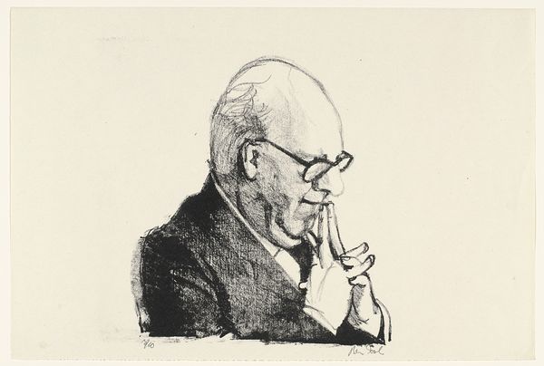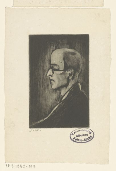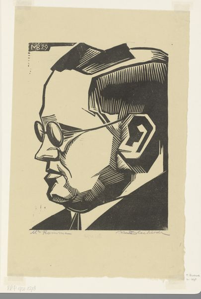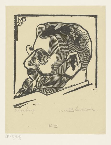 This is Meijer Bleekrode's "Portret van Jan van den Tempel," a woodcut print from 1929, housed in the Rijksmuseum. The stark contrast between black ink and the off-white paper creates a visually compelling image. The portrait is defined by bold, angular lines that dissect the planes of the face, lending the subject a sense of monumentality and seriousness. The formal approach simplifies features into geometric shapes and blocks of shadow, challenging conventional portraiture. Consider how Bleekrode employs the woodcut technique itself. The sharp, carved lines and textured surfaces are integral to the portrait's expressive power. There is a tension between representation and abstraction, which destabilizes the traditional function of portraiture as a mere likeness. The print prompts us to consider the semiotic interplay between image, sign, and interpretation. The visual structure isn't just a formal exercise; it engages with broader ideas about identity, representation, and the artist's role in constructing meaning. The print remains an open field for interpretation and debate.