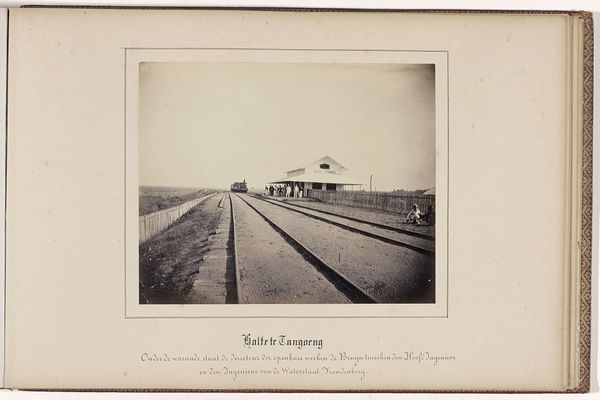 Editor: This albumen silver print, titled "Appomattox Station, Virginia," is credited to Timothy H. O'Sullivan. I'm struck by the starkness of the railway lines slicing through the landscape. What compositional elements stand out to you? Curator: Notice how the converging railway lines lead the eye directly to the modest building in the background. The contrast between the rigid geometry of the tracks and the more organic forms of the surrounding nature is quite pronounced. It creates a visual tension. Editor: I hadn't considered that tension. Do you see any significance in the placement of the figures along the tracks? Curator: Their placement is strategic. They serve to emphasize the scale of the scene and add a human element to an otherwise desolate landscape. Consider the tonal range – how does the artist use light and shadow to define form and space? Editor: The limited tonal range almost flattens the image, enhancing the sense of distance. I see how O’Sullivan uses formal elements to create a sense of place. Curator: Indeed. Paying close attention to these elements allows us to fully appreciate the photograph's inherent qualities.
