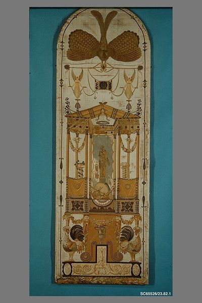 Editor: Here we have Jean Démosthène Dugourc's "Verdures du Vatican," made between 1785 and 1795. It's a textile piece, and what strikes me most is the symmetrical composition. The color palette is muted, almost faded. How do you interpret this work, especially considering its time period? Curator: This piece speaks volumes about the late 18th century. While seemingly decorative, the textile reflects complex social hierarchies and the opulence of the French aristocracy on the eve of revolution. The birds, the floral arrangements, even the birdcage motif, were symbols of status, luxury, and control over nature. Considering its time of production, how does the piece reflect broader conversations about identity and power at the time? Editor: It does feel quite extravagant, knowing what was about to happen with the French Revolution. The symmetry almost feels like an assertion of order. It is difficult to imagine such items, as innocent as they appear, were for the aristocratic elite. What were these tapestries and wall hangings for in practice? Curator: Textiles like these weren't just decorative; they shaped the spaces people inhabited. They signaled wealth, taste, and belonging to a privileged class. Each motif has roots to colonization and inequality. And the “Verdures du Vatican,” can serve as a stark reminder that objects, seemingly benign, often carry histories of privilege and exploitation. It makes one consider fashion in contemporary society. What message might fashion send in our own cultural time? Editor: That's fascinating. I never thought of decorative art as being so tied to social issues and political statements, even if indirect ones. Thanks! Curator: Likewise. I've really benefited from thinking with you through the complex intersections of power and artistry that converge within “Verdures du Vatican”.