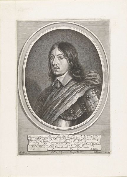 Curator: Here we have a captivating print, "Portret van Willem II, prins van Oranje," created in 1641 by Hendrick Hondius I. The print, an engraving, offers a glimpse into the appearance of Prince William II. Editor: There’s a stillness to it, isn't there? The formal pose contrasted with the soft rendering of the young prince’s features gives a feeling of constrained power, like something just waiting to be unleashed. Curator: Precisely! The tight composition, framed by that oval, creates a contained space, emblematic perhaps of the pressures and expectations weighing on someone born into such a position. Notice the detailing on the prince's doublet—the textures rendered solely through line work. Hondius masterfully uses the engraving technique to convey both light and material. Editor: And considering the historical context—William II’s relatively short reign, his struggles with the States General, and his sudden death—one might see a tragic foreshadowing in that contained composition. Born into privilege, yes, but also into a predetermined script from which there was little escape. He's rendered not as an individual, but as a figurehead even as a child. Curator: A compelling reading! We must consider, of course, the conventions of portraiture at the time. This isn't necessarily a personalized depiction; instead, it’s designed to project status and dynastic power. The use of Latin phrases in the inscription solidifies the portrayal. Editor: Still, even within those constraints, the artist makes choices. He chose to focus on this young man, on his youth, to display this vulnerability so publicly while the expectations of the royal family stand ready to consume the young royal's potential individuality. I’m seeing a poignant commentary on the loss of self in the pursuit of power. Curator: Fascinating to consider. These seemingly conventional renderings contain multitudes. It highlights how even in seemingly straightforward representations, art always opens space for contemporary interpretation. Editor: It encourages us to continuously ask what stories can we read in it now! What's more exciting and crucial than using historical artifacts to inform contemporary understanding.