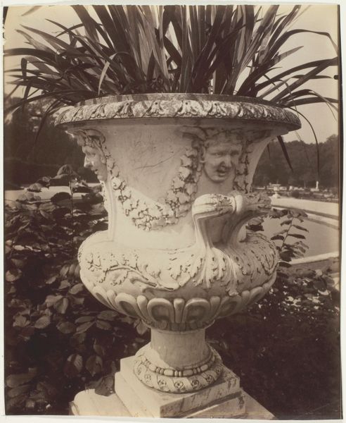 Editor: This photograph by Eugène Atget, called "Versailles, Vase," was taken around 1905. It feels heavy, like a relic of another era. What stands out to you? Curator: The vase immediately strikes me with its overt symbolism. Think about it – we have this classical form, adorned with cherubic figures and clusters of grapes. What do those elements evoke for you? Editor: I suppose cherubs speak to innocence, even love, and grapes, given their connection to wine, suggest celebration or even indulgence. Curator: Exactly. And that combination is quite intentional. Remember Versailles itself – a symbol of royal power and extravagant pleasure. Atget, through his lens, is capturing not just a vase, but an echo of a bygone era and its values. The classical vase shape connects it to ancient notions of beauty. Editor: So the photograph itself acts as a visual record, linking the present—Atget's time—back to the French monarchy's opulence? Curator: Precisely. It's a tangible link, a cultural artifact frozen in time. Consider how the soft sepia tone adds to the sense of nostalgia. It's more than just a photo; it's a meditation on history and memory, using the vase as a key image to explore those grand ideas. Editor: I see now that Atget isn't just photographing a vase; he's capturing a complex web of historical and symbolic associations. I never thought a photograph could carry so much! Curator: Indeed! Photography, at its finest, allows us to explore the layers of meaning embedded within seemingly simple objects and landscapes. It transforms our everyday world into a canvas of memory.