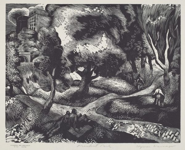 Curator: "Spring in the Garden," crafted by Wanda Gág in 1927, invites us into an enchanting landscape through the mediums of drawing and print, notably featuring graphite. The geometric composition is what really hits me right off the bat. Editor: Oh, wow! That title, "Spring in the Garden"... I get a whimsical, slightly eerie vibe. Like the Brothers Grimm doing a landscape. Does that even make sense? Curator: Absolutely! Gág’s hand transforms what could be a serene garden scene into something…almost otherworldly. See how she uses the graphite? The lines create such textural intensity; it’s both inviting and slightly unsettling. Editor: You’re right. The linear patterns are wild and fascinating, almost like everything's vibrating with hidden energy. Especially around the house – it’s practically being swallowed by the landscape. There is a powerful dynamic here! Do you see a theoretical meaning here? Curator: Well, that swallowing-up aspect is really interesting. Gág had some serious philosophical and theoretical leanings; what if she is questioning humanity's role within nature itself, suggesting an organic supremacy over the geometrical constructs? Is the human-made falling back into nature? The organic forms, nearly consuming the geometric architecture of the house and fence—fascinating. Editor: Exactly! And how she lets that tangled brush in the foreground dominate. The artist doesn't shy away from what is deemed ordinary or chaotic. She gives an amazing compositional relevance here. Curator: Indeed! Gág doesn’t offer us a picturesque view; she throws us right into the tangled heart of it, letting the "chaos", as you name it, bloom. She's asking us to contemplate life's complex beauty... not to be content with idealized aesthetics. This piece really asks some questions from the viewer. Editor: Makes you wonder what that garden was really like and, more importantly, what was growing on in her creative head, eh? Curator: Totally! It is like looking at an artist's soul. It has a profound feel for her vision.
