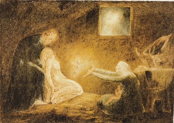 Editor: Here we have "The Dream of Lancelot (Study)" by Edward Burne-Jones, done in tempera, watercolor, and gouache. The color palette gives off a melancholy, dreamlike atmosphere. How do you interpret this work, considering its connection to Arthurian legend? Curator: The scene pulls us into the intricate web of desire, duty, and spiritual yearning that defined much of Pre-Raphaelite art. Burne-Jones often used Arthurian legends to explore the Victorian era's complex relationship with morality, gender, and the allure of the unattainable. Notice how Lancelot is passively positioned, almost vulnerable, and is being watched over by a golden angel figure. The composition makes one ask whether this symbolizes his inner turmoil or a societal judgment upon his illicit desires? Editor: I see what you mean. It does seem like a commentary on societal expectations and individual longing, especially within the constraints placed on women at the time, mirroring Guinevere's position in the love triangle. The legend definitely highlights their restricted agency. Curator: Precisely. These artists were keen on the use of symbolism that served to comment on power dynamics, both romantic and social. They actively promoted change while revisiting medieval and mythical themes in reaction to modern industrialization. How does the painting’s visual language support or subvert traditional narratives, especially considering the period’s social anxieties around gender roles and female sexuality? Editor: Now that you mention it, the subdued color palette seems to hint at hidden, forbidden love. Perhaps there is something feminist about portraying these vulnerabilities so openly, rather than painting over the reality of human nature. Curator: I would agree. And through art, there can be greater societal changes in seeing such open portrayals. Burne-Jones provides insight into suppressed realities within those gender roles, as you pointed out. Editor: That’s so helpful! It really reshapes my initial reading. Curator: Agreed.