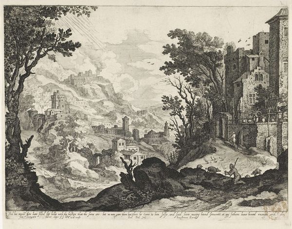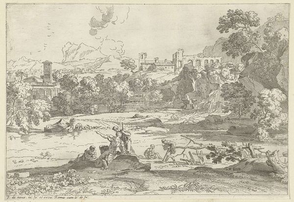 Curator: We’re now looking at “The Inn in a Ruin,” an etching made by Simon de Vlieger sometime between 1610 and 1653. Editor: My initial impression is one of wistful decay. The tonality emphasizes a contrast between light and shadow, highlighting both the dilapidated structure and a sense of bygone serenity. Curator: Precisely. De Vlieger’s expert use of the etching technique creates subtle tonal variations and fine detail, notice the lines evoking texture, particularly within the architecture and cloud formations. The composition itself relies on a juxtaposition of horizontal and vertical elements, lending a structural balance despite the ruined state. Editor: The inn ruin certainly takes center stage. I see an array of figures going about their business - an image of everyday life contrasts strongly with the romantic notion of ancient ruins and decay. It prompts reflections on the nature of time. Curator: Note also how the architecture incorporates foliage – trees grow amongst the stonework, adding dynamism. The integration of the human, the built, and the natural further serves as a critical component within de Vlieger’s broader aesthetic project. Editor: And on the distant shore across the river I spy a miniature rendering of the city's form! What might be interpreted here? Do the merchants crossing the channel perhaps desire a sense of commerce or a far-flung voyage to their urban counterparts? I imagine they might aspire to it, laden down by pack animals as they appear to be. Curator: Perhaps de Vlieger is considering ideas around transience itself; he could be suggesting how the structures that once defined a civilization are impermanent; that nature inevitably reclaims everything in the end. The cloud cover is a marvel, and the eye, as a result of his art, wonders what lies beyond the frame itself. Editor: Yes, these images evoke thoughts on how fleeting our existence is - how these cultural symbols shape and mold memories, providing collective ways to come together as humans do now. Curator: Ultimately, Vlieger compels a contemplation on time, decay, and how the past continually interfaces with the present moment. Editor: Absolutely. A profound exploration woven into a seemingly simple scene of rural life, mediated via de Vlieger’s wonderful sense for symbolism!