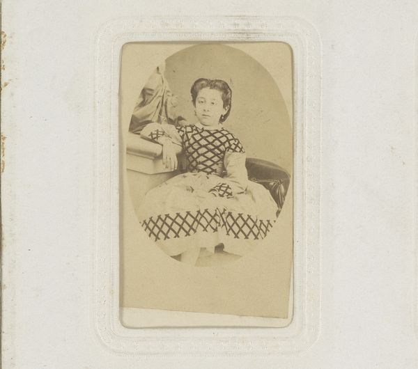Curator: The photographic portrait before us, dating from 1860 to 1900, captures a seated girl alongside a doll. The image is attributed to A. Delamare & A. Raguet. Editor: My first impression is one of subdued opulence. There’s something deeply intimate, almost melancholy, in the staging, particularly considering the materials and possible techniques of early photography. It feels simultaneously familiar and distant. Curator: Absolutely. The girl's posture and expression hint at societal expectations already being imposed. And consider the doll, an icon of childhood innocence, yet here it almost seems like a prop, reflecting the role she’s expected to play. Editor: Yes, but I also see that highly patterned fabric of her dress – that required skill, labor, specific looms, global trade, perhaps even exploited labor. Photography flattens all that detail, obscures its social fingerprint while seemingly capturing it. It brings up questions about production. Curator: That's an insightful observation. The flattening does also underscore the symbols presented, such as the footstool, literally elevating her position, hinting at status. It presents the social structure in a way that speaks directly to ambition and expectations of feminine identity. Editor: I suppose the point of portraiture has always been, at its heart, economic. It serves as a record of transactions and displays social standing more than it captures authentic presence. The materials and methods always frame the subject in such a specific light. Curator: It’s a dialogue between intent and reality. Consider the carefully constructed backdrop of light and shadow—the manipulation creates an enduring image that’s ripe with multiple possible readings. Editor: These glimpses are always loaded with the labor, commerce, and material realities of their creation, a counterpoint to their ostensible subjects. We're seeing how people lived, produced, and represented themselves at the time. Curator: Indeed. By unpacking the layers, we can understand the historical memory encapsulated within it—how values, dreams, and even oppressions, become visible. Editor: Understanding both that image and those conditions provides access to deeper and wider histories.