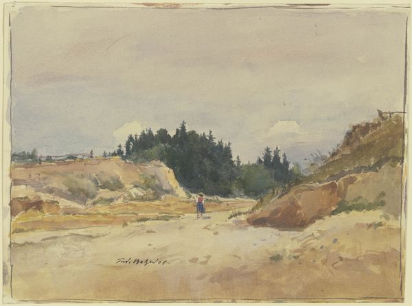 Curator: It's rather melancholic, isn't it? All soft greens and greys. Makes you think of hushed footsteps and the smell of damp earth. Editor: Let’s take a look at “Berghelling met dennen,” or “Mountainside with Pines,” by Guillaume Anne van der Brugghen, likely painted sometime between 1821 and 1891 using oil on what looks like a canvas prepared with a thin ground. Curator: The pines give it a sense of scale. They tower, silent observers over this little path cutting across the hillside. Like they know something we don’t. I feel incredibly small. Editor: Small and… somewhat removed? Look at the brushwork. It's undeniably plein-air – you can see the speed and immediacy. This isn't a polished, idealized scene crafted in a studio; it is labor, executed outdoors with raw material quickly laid on, and speaks to a shifting artistic landscape of valuing real versus idealized vision. Curator: Exactly. And it's that raw quality, that imperfection, that speaks volumes. The blurry edges of the trees, the way the colors bleed into each other… it mimics how memory works. Like a half-remembered dream. It tugs. Editor: But who was Brugghen painting for? Think about the intended audience, how paintings of rural life fed into this emergent concept of romantic nationalism – who is imagining or idealizing whose "nature" experience, and how does that function socioeconomically in that period? Curator: Ah, now you are breaking my reverie. It reminds us that even the most intimate reflections were created for someone, shaped by very concrete things. But, as the great poet once wrote, “A thing of beauty is a joy forever”, but also shaped forever by consumption… So there. Editor: A tension between personal vision and production, captured in paint. Not a bad find for a Tuesday morning contemplation.
